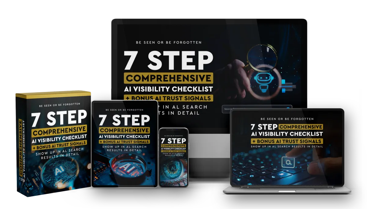 You’ll get the AI Visibility Checklist — a fully expanded 7-step guide that lays out exactly what AI engines are already weighing when they decide whether to recommend your brand or not. Plus, you’ll also receive the Bonus AI Trust Signals Cheat Sheet — a one-page, high-level visual map that shows you the four main categories of signals you must have in place. Together, these documents give you clarity, structure, and confidence without guesswork.
